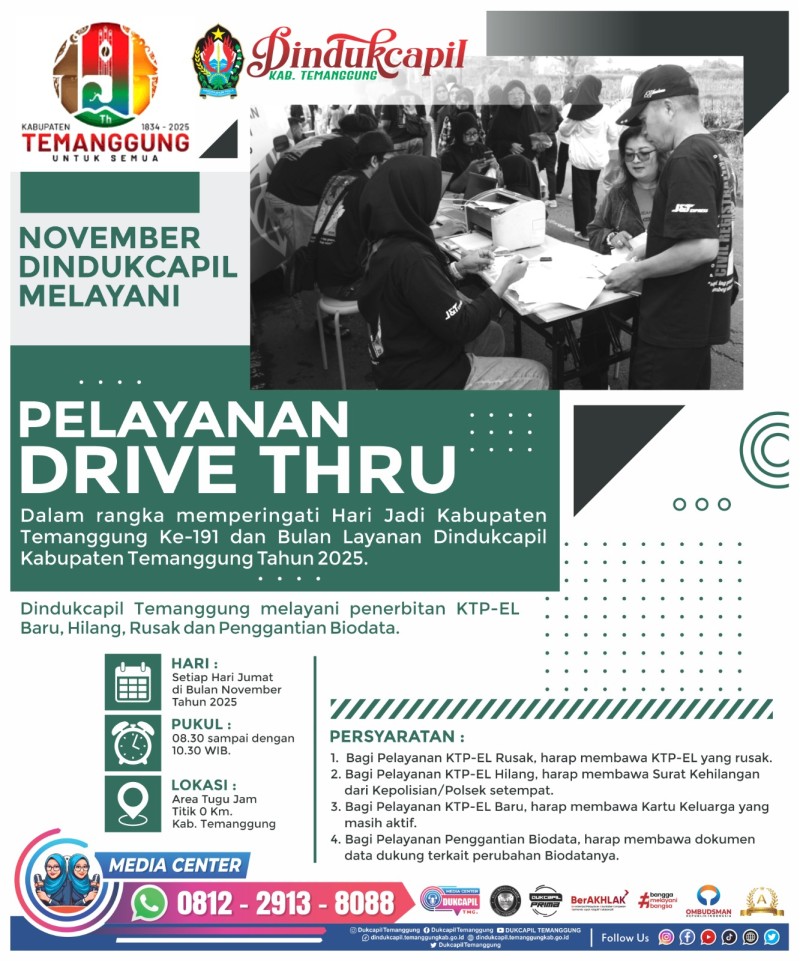 Kategori Lainnya Kategori: Smart Government (Pemerintah Cerdas) , Lainnya 14 November 2025 09:00:00 43 Survei Kepuasan Masyarakat (SKM) Triwulan III Tahun 2025 Selengkapnya Kategori: Smart Government (Pemerintah Cerdas) , Lainnya 10 November 2025 08:00:00 22 Selamat Memperingati Hari Pahlawan Dan Selamat Hari Jadi Kabupateb Temanggung yang ke 191. Selengkapnya Kategori: Smart Government (Pemerintah Cerdas) , Lainnya 07 November 2025 11:00:00 26 Pelayanan Drive Thru di Area Tugu Jam, Titik 0 Km Temanggung Selengkapnya Kategori: Smart Government (Pemerintah Cerdas) , Lainnya 05 November 2025 09:45:00 30 ???? PELAYANAN DRIVE THRU DINDUKCAPIL TEMANGGUNG! ???? Selengkapnya Kategori: Smart Government (Pemerintah Cerdas) , Lainnya 03 November 2025 09:00:00 29 ???? NOVEMBER, DINDUKCAPIL MELAYANI! ???? Selengkapnya Kategori: Smart Government (Pemerintah Cerdas) , Lainnya 29 Oktober 2025 10:45:00 28 Evaluasi Pelayanan Desa Permata dan Pemantapan Pelaksanaan 0Rp 0Km melalui Zoom Meeting Selengkapnya Kategori: Smart Government (Pemerintah Cerdas) , Lainnya 29 Oktober 2025 10:45:00 28 Evaluasi Pelayanan Desa Permata dan Pemantapan Pelaksanaan 0Rp 0Km melalui Zoom Meeting Selengkapnya Kategori: Smart Government (Pemerintah Cerdas) , Lainnya 29 Oktober 2025 09:42:00 21 Jemput Bola Perekaman KTP-el Sekolah Selengkapnya Kategori: Smart Government (Pemerintah Cerdas) , Lainnya 29 Oktober 2025 08:37:00 21 Pelepasan Purna Tugas Bagi Ibu Dra. Tri Herlinawati Selengkapnya Kategori: Smart Government (Pemerintah Cerdas) , Lainnya 28 Oktober 2025 08:35:00 28 Hari Sumpah Pemuda. 28 Oktober 2025. Selengkapnya Kategori: Smart Government (Pemerintah Cerdas) , Lainnya 27 Oktober 2025 11:32:00 17 Jemput Bola Perekaman KTP-el di SMK Negeri 1 Bansari Selengkapnya Kategori: Smart Government (Pemerintah Cerdas) , Lainnya 27 Oktober 2025 11:32:00 20 Pengajuan Akta Kematian Kolektif Selengkapnya 123NextLast